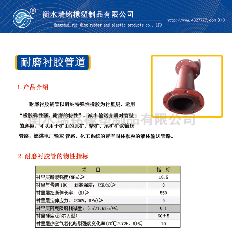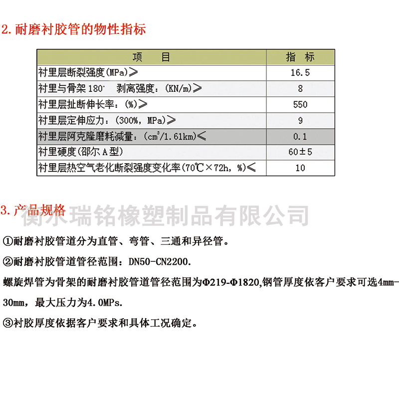 (1)耐磨衬胶管的物性指标: